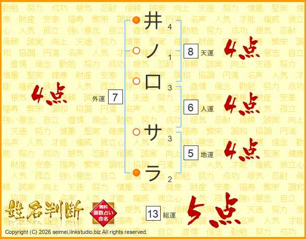 井(4画)ノ(1画)口(3画) サ(3画)ラ(2画)