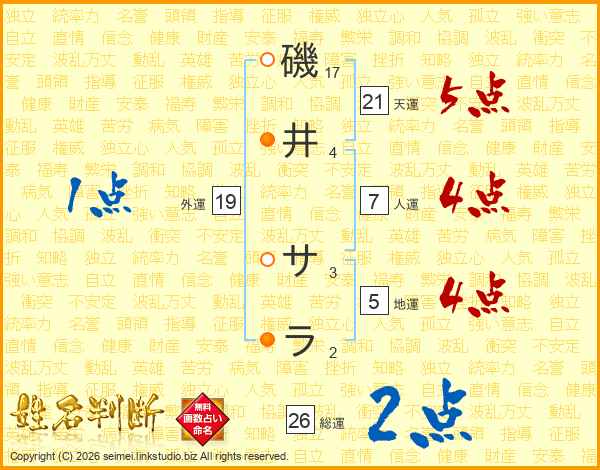 生活面を象徴する運勢です。外部から受ける影響力を表し、結婚運、家庭運や職場、環境への順応性を表します。総運から人運を引いた画数。姓や名が1文字の場合を除く。