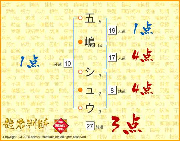 五(5画)嶋(14画) シ(3画)ュ(2画)ウ(3画)