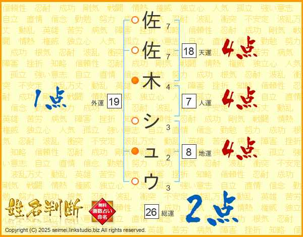 佐(7画)佐(7画)木(4画) シ(3画)ュ(2画)ウ(3画)