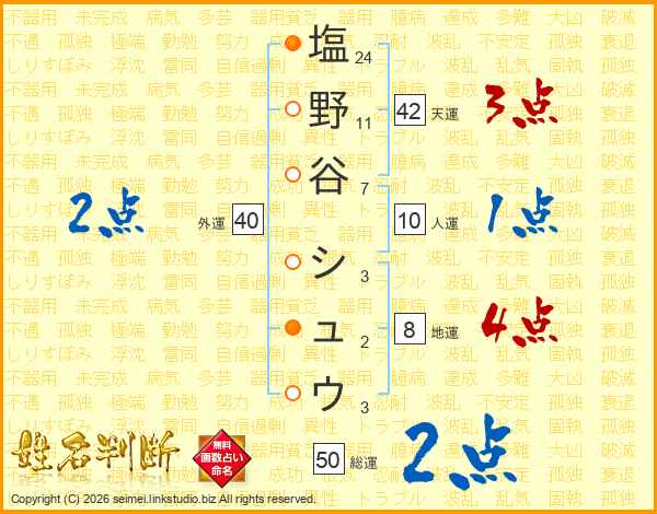 塩(24画)野(11画)谷(7画) シ(3画)ュ(2画)ウ(3画)