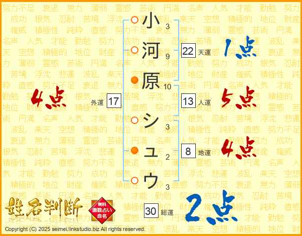 生活面を象徴する運勢です。外部から受ける影響力を表し、結婚運、家庭運や職場、環境への順応性を表します。総運から人運を引いた画数。姓や名が1文字の場合を除く。