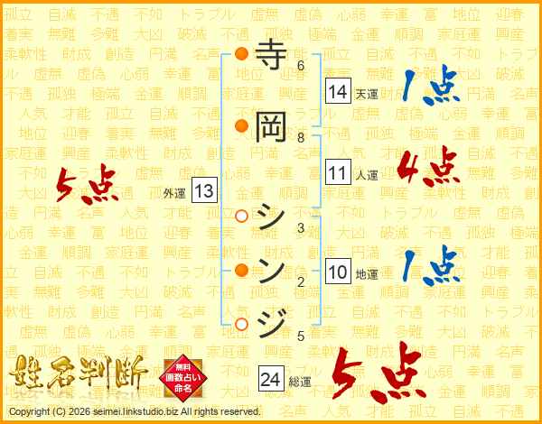 寺(6画)岡(8画) シ(3画)ン(2画)ジ(5画)