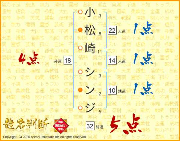 小(3画)松(8画)崎(11画) シ(3画)ン(2画)ジ(5画)