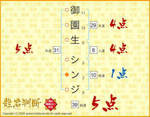 御(11画)園(13画)生(5画) シ(3画)ン(2画)ジ(5画)
