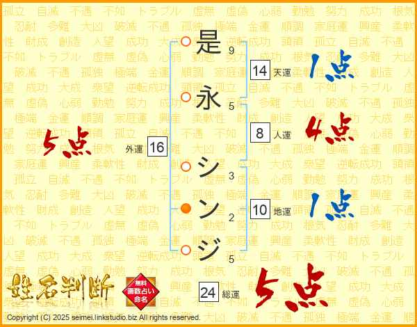是(9画)永(5画) シ(3画)ン(2画)ジ(5画)
