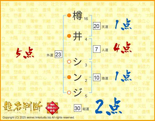 樽(16画)井(4画) シ(3画)ン(2画)ジ(5画)