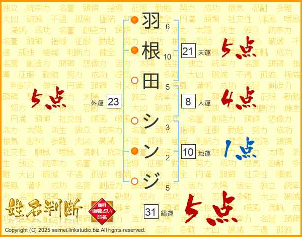 羽(6画)根(10画)田(5画) シ(3画)ン(2画)ジ(5画)