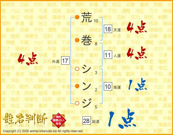 荒(10画)巻(8画) シ(3画)ン(2画)ジ(5画)