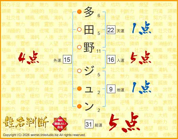 あなたの人生を表す1番重要な運勢です。生涯を通じて影響する総合運となり、主に50歳以降の晩年期に影響を及ぼします。苗字と名前の合計画数。