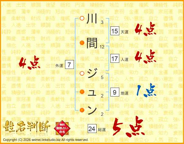 川間ジュンさんの天運は15画の4点!