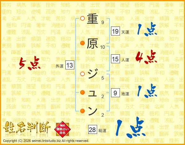 重(9画)原(10画) ジ(5画)ュ(2画)ン(2画)