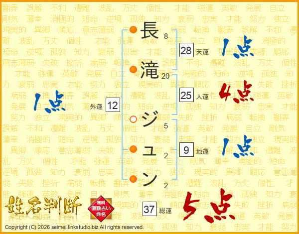 長(8画)滝(20画) ジ(5画)ュ(2画)ン(2画)