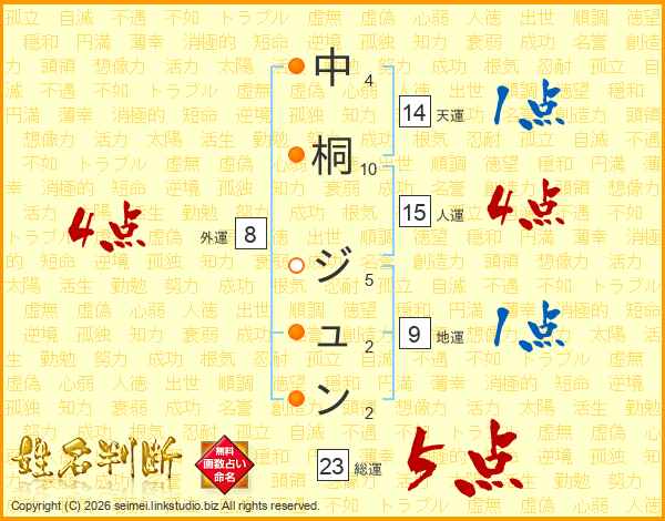 中(4画)桐(10画) ジ(5画)ュ(2画)ン(2画)