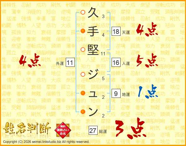 久(3画)手(4画)堅(11画) ジ(5画)ュ(2画)ン(2画)