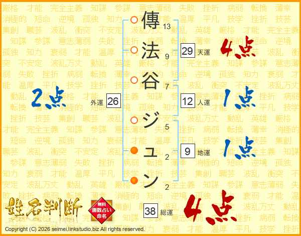 生活面を象徴する運勢です。外部から受ける影響力を表し、結婚運、家庭運や職場、環境への順応性を表します。総運から人運を引いた画数。姓や名が1文字の場合を除く。