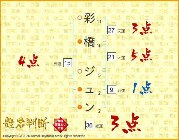 彩橋ジュンさんの天運は27画の3点!