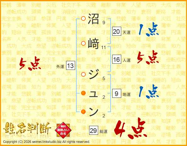 沼﨑ジュンさんの総運は29画の4点!