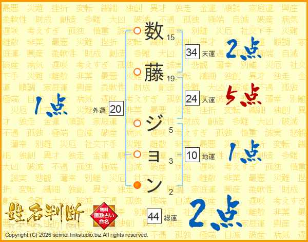 数(15画)藤(19画) ジ(5画)ョ(3画)ン(2画)