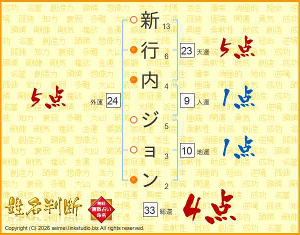 新(13画)行(6画)内(4画) ジ(5画)ョ(3画)ン(2画)