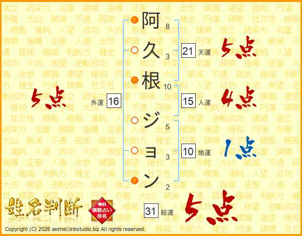 阿(8画)久(3画)根(10画) ジ(5画)ョ(3画)ン(2画)