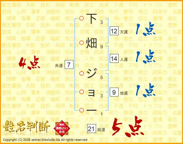 下畑ジョーさんの総運は21画の5点!