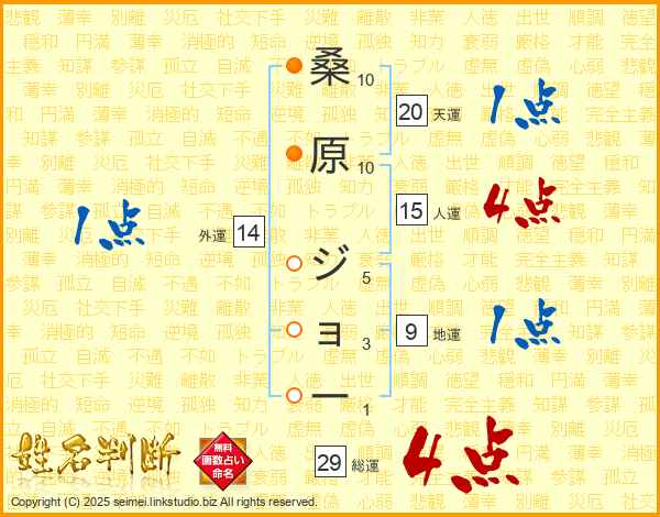 桑(10画)原(10画) ジ(5画)ョ(3画)ー(1画)