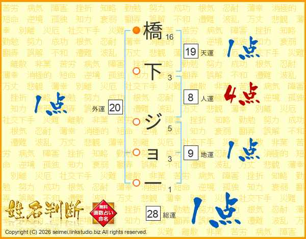 橋(16画)下(3画) ジ(5画)ョ(3画)ー(1画)