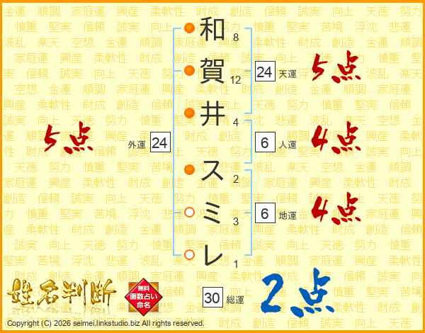 和(8画)賀(12画)井(4画) ス(2画)ミ(3画)レ(1画)