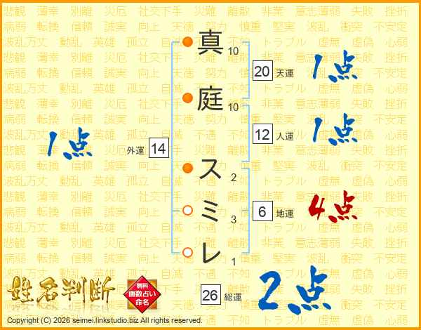 生活面を象徴する運勢です。外部から受ける影響力を表し、結婚運、家庭運や職場、環境への順応性を表します。総運から人運を引いた画数。姓や名が1文字の場合を除く。