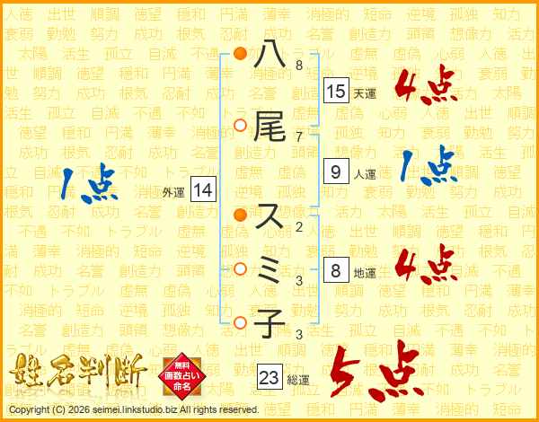 生活面を象徴する運勢です。外部から受ける影響力を表し、結婚運、家庭運や職場、環境への順応性を表します。総運から人運を引いた画数。姓や名が1文字の場合を除く。
