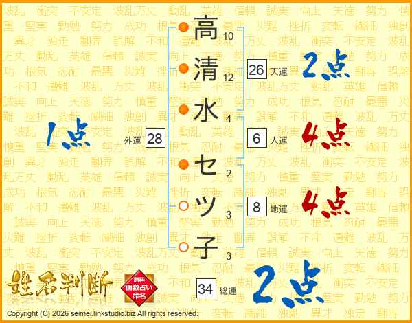 高清水セツ子さんの総運は34画の2点!