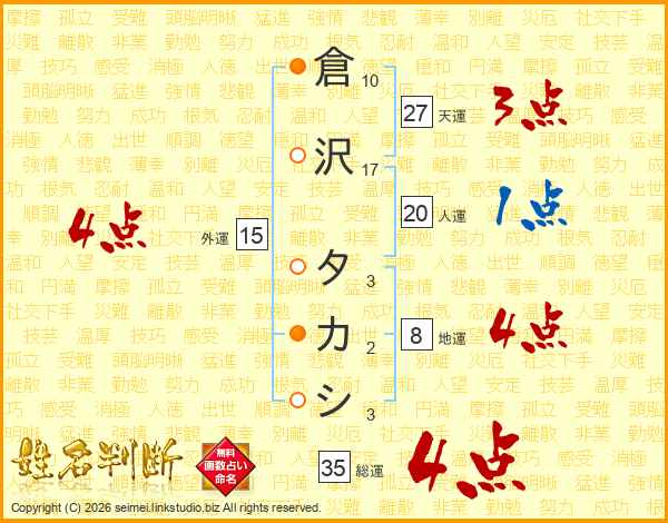 倉(10画)沢(17画) タ(3画)カ(2画)シ(3画)