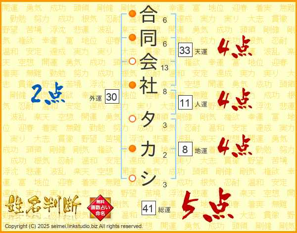 合(6画)同(6画)会(13画)社(8画) タ(3画)カ(2画)シ(3画)