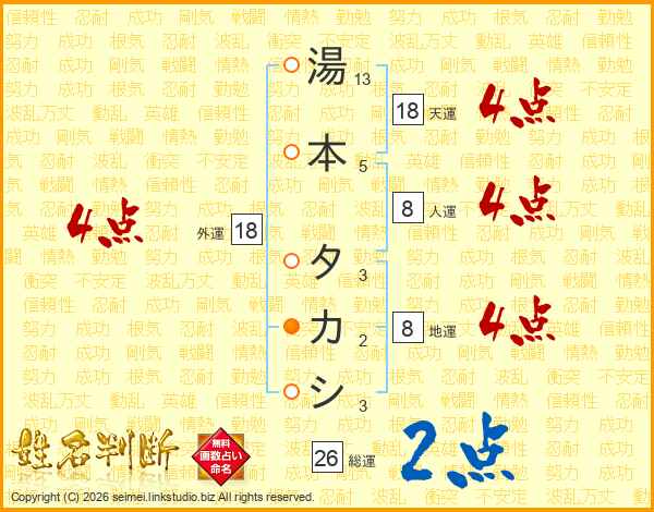 湯(13画)本(5画) タ(3画)カ(2画)シ(3画)