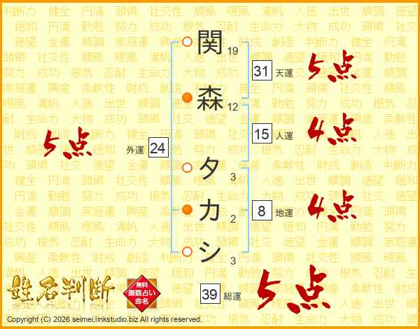 関森タカシさんの総運は39画の5点!
