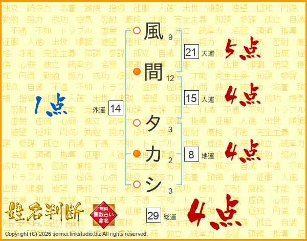 風間タカシさんの総運は29画の4点!