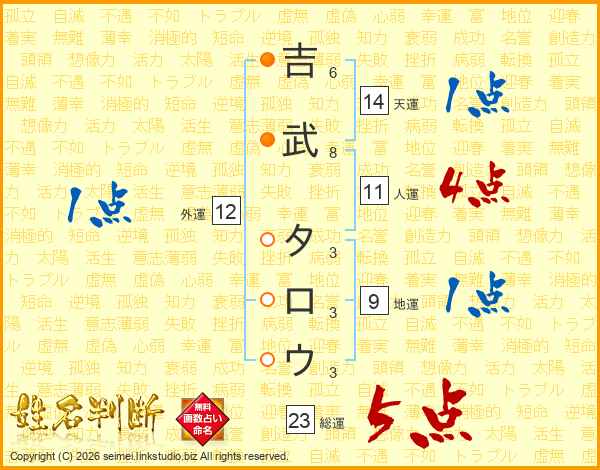 吉(6画)武(8画) タ(3画)ロ(3画)ウ(3画)