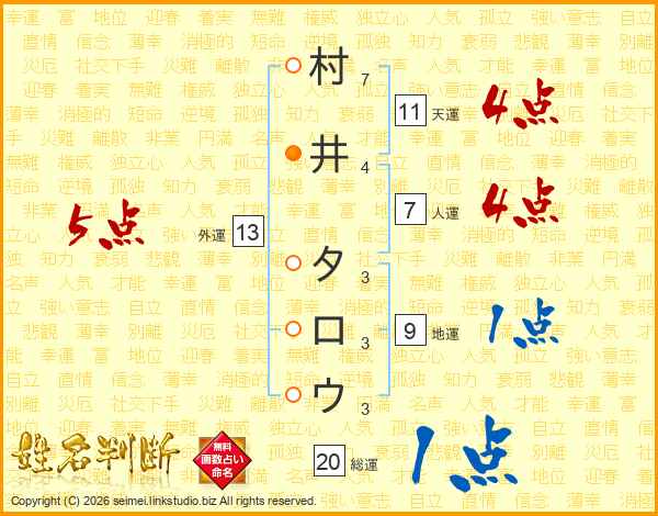 あなたの人生を表す1番重要な運勢です。生涯を通じて影響する総合運となり、主に50歳以降の晩年期に影響を及ぼします。苗字と名前の合計画数。