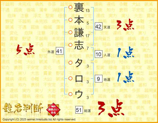 裏(13画)本(5画)謙(17画)志(7画) タ(3画)ロ(3画)ウ(3画)