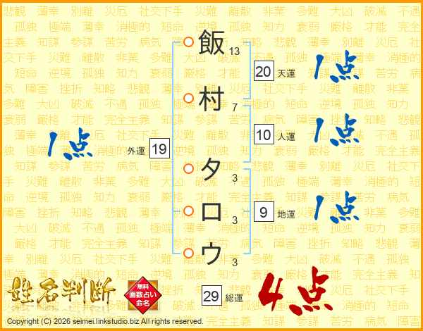 飯村タロウさんの総運は29画の4点!