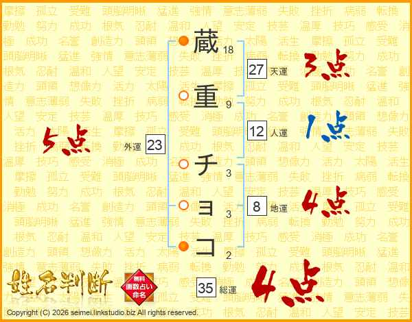 蔵(18画)重(9画) チ(3画)ョ(3画)コ(2画)