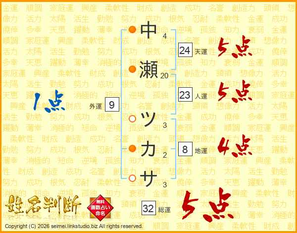 中(4画)瀬(20画) ツ(3画)カ(2画)サ(3画)