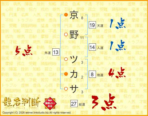 京野ツカサさんの総運は27画の3点!
