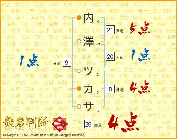 内澤ツカサさんの総運は29画の4点!