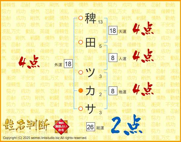 生活面を象徴する運勢です。外部から受ける影響力を表し、結婚運、家庭運や職場、環境への順応性を表します。総運から人運を引いた画数。姓や名が1文字の場合を除く。