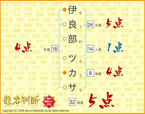 伊(6画)良(7画)部(11画) ツ(3画)カ(2画)サ(3画)