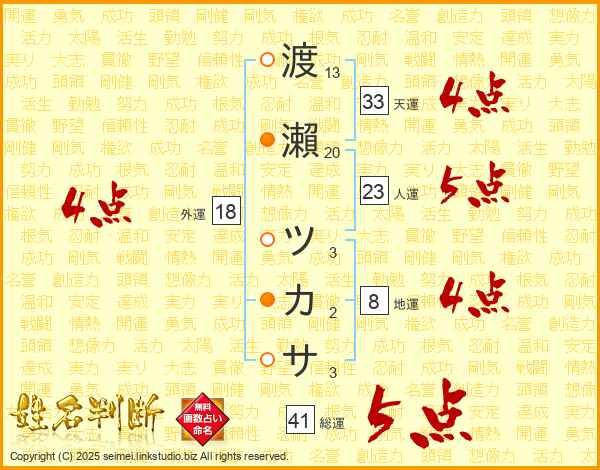渡(13画)瀨(20画) ツ(3画)カ(2画)サ(3画)