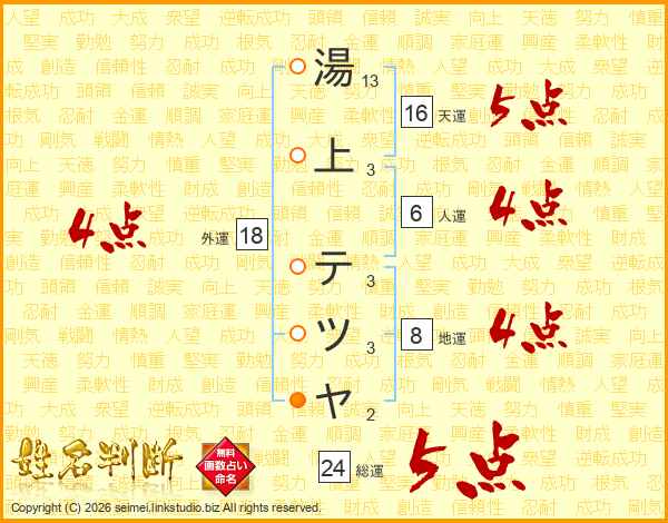 湯上テツヤさんの総運は24画の5点!