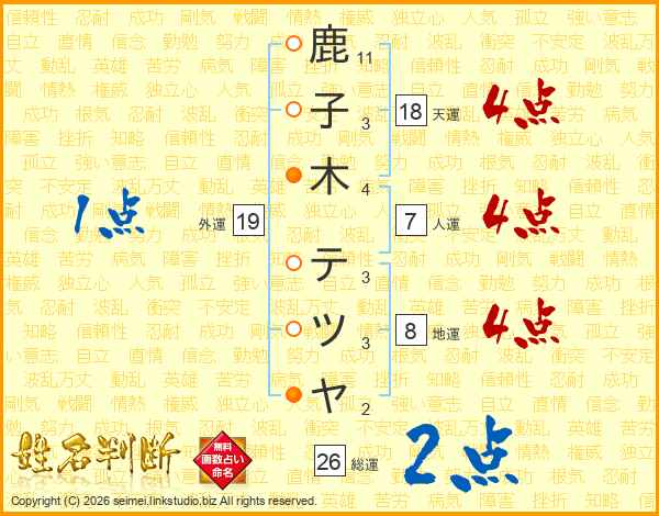 鹿(11画)子(3画)木(4画) テ(3画)ツ(3画)ヤ(2画)